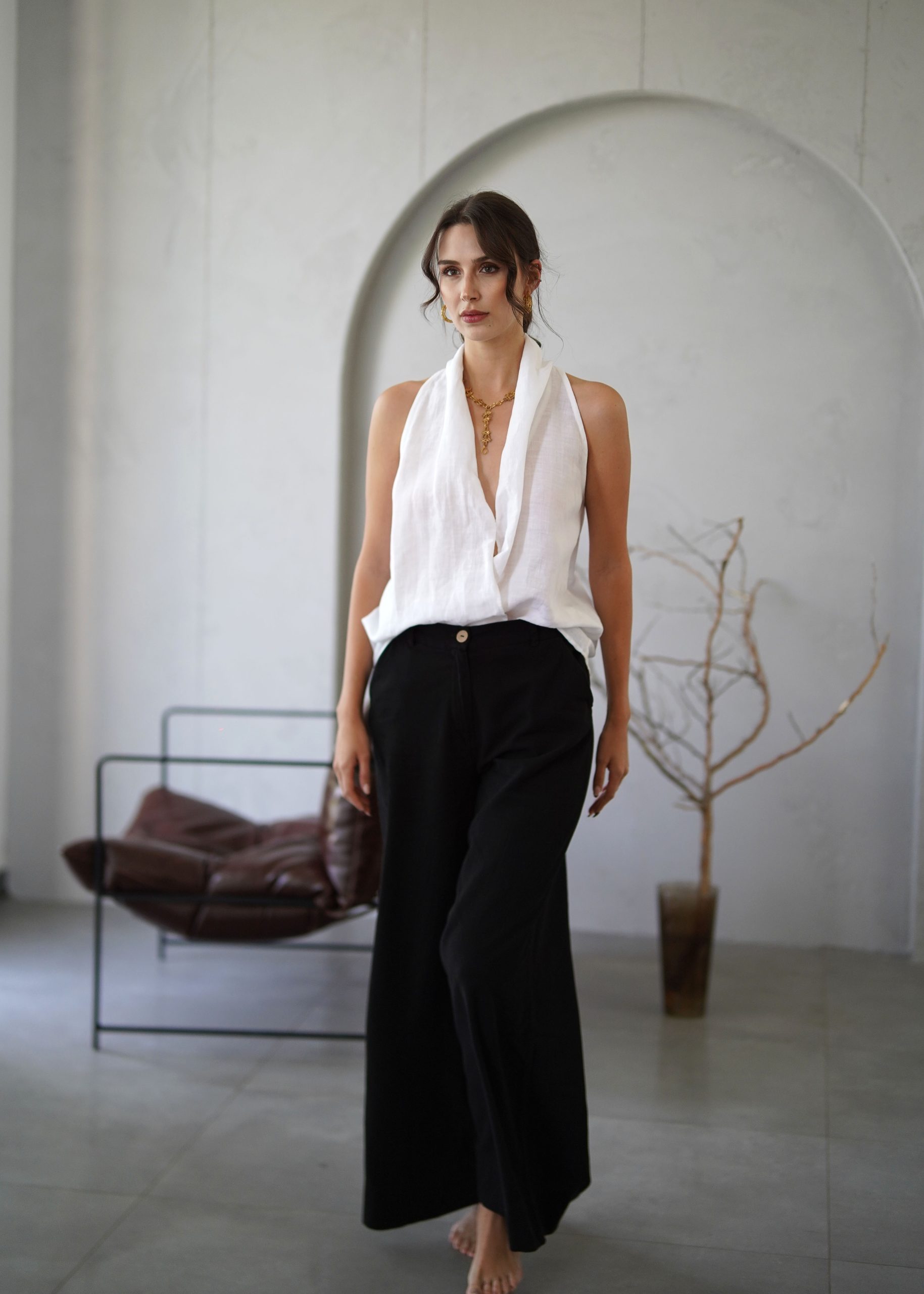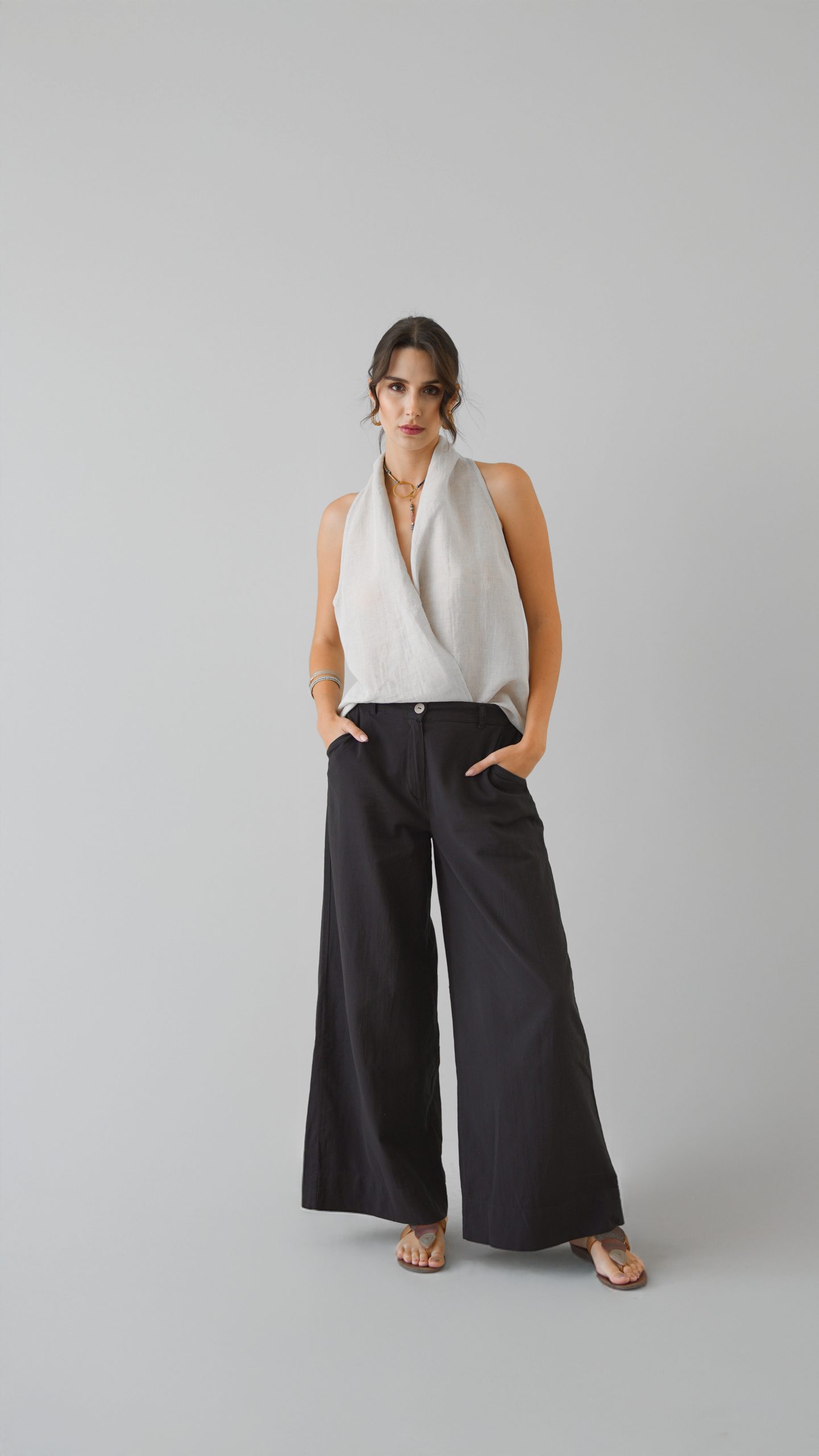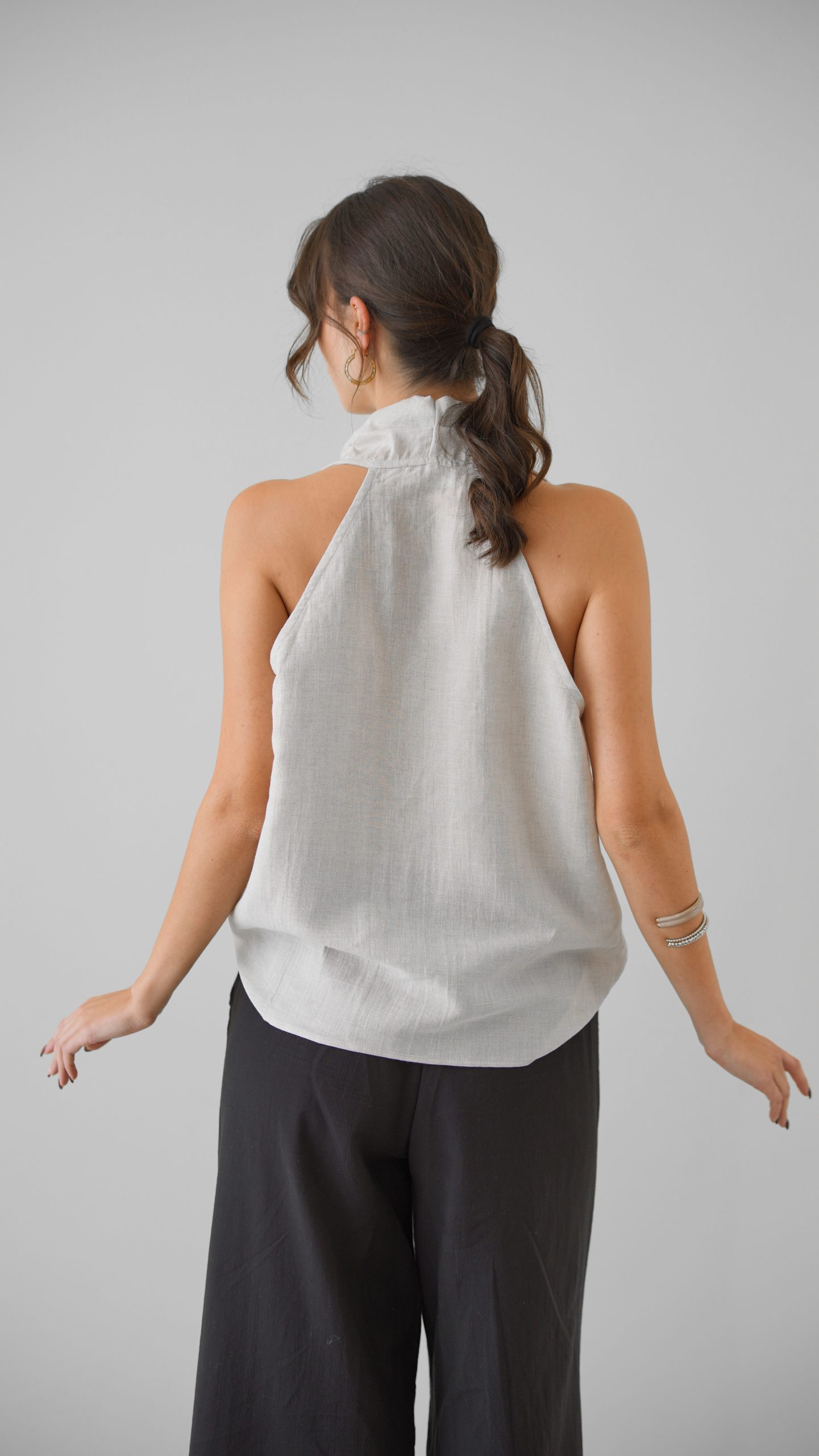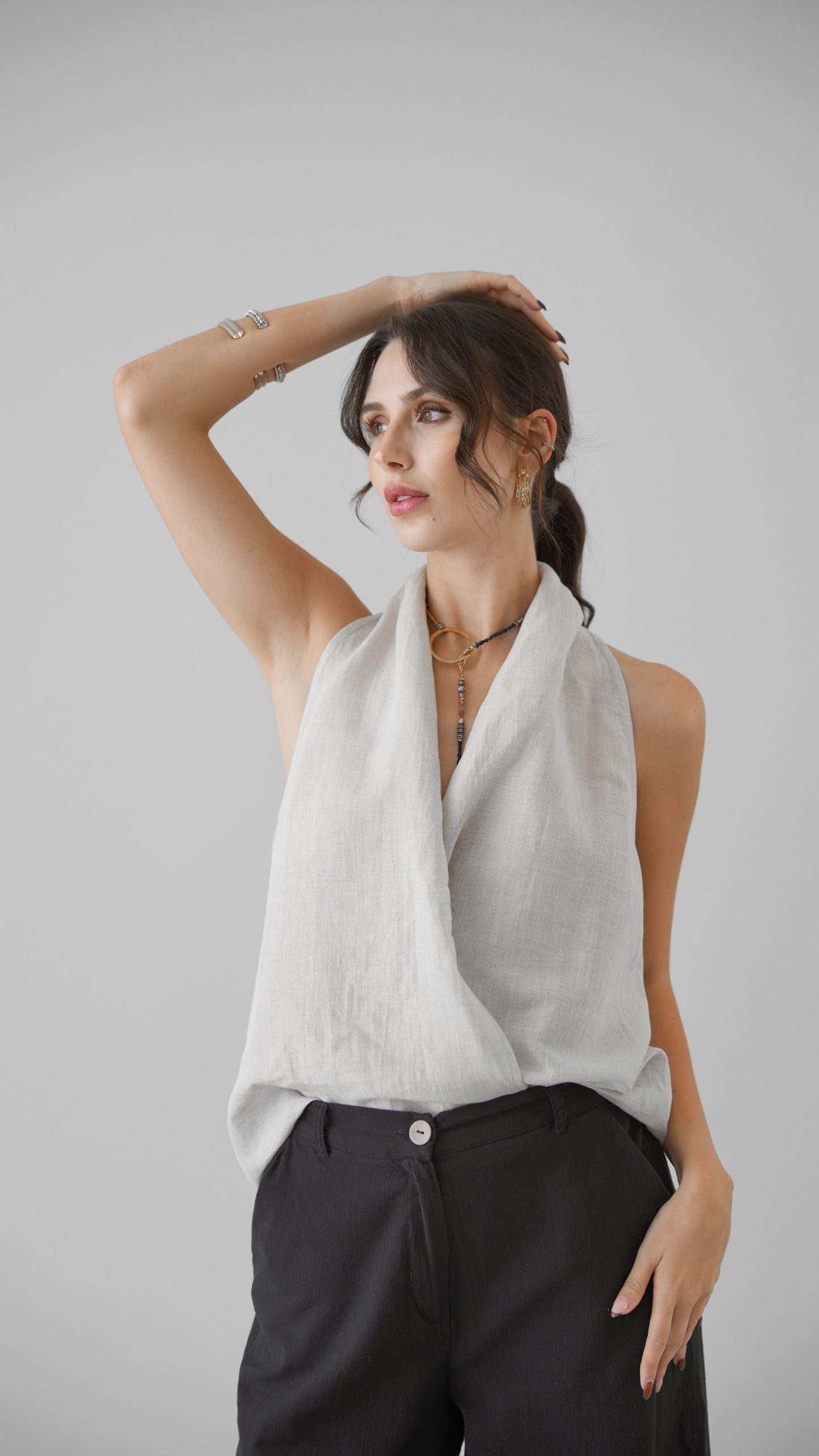 Klasik Vual ve doğal Ketenin kusursuz birleşimi: Viaanka'ya özel üretilen bu kumaş, %80 Ketenin tok duruşunu %20 Pamuk Vualin ipeksi hafifliğiyle harmanlar. Halter yaka kesimi modern bir zarafet sunarken, kumaşın nefes alabilen yapısı İlkbahar ve Yaz aylarının sıcaklarına karşı doğal bir koruma sağlar.