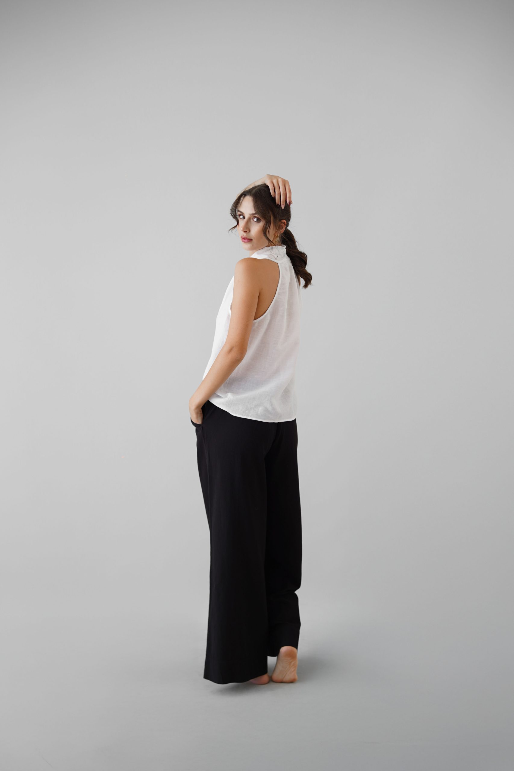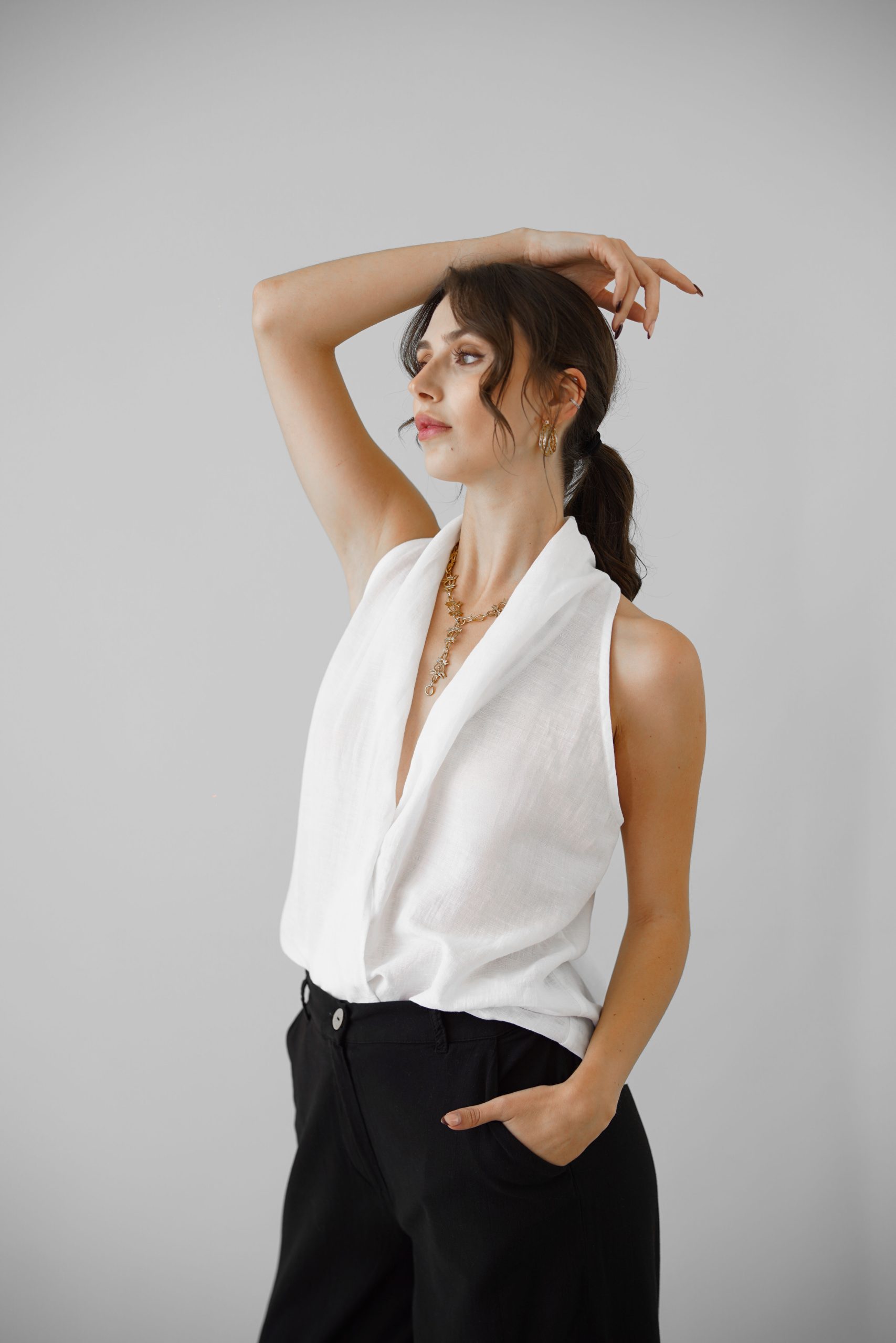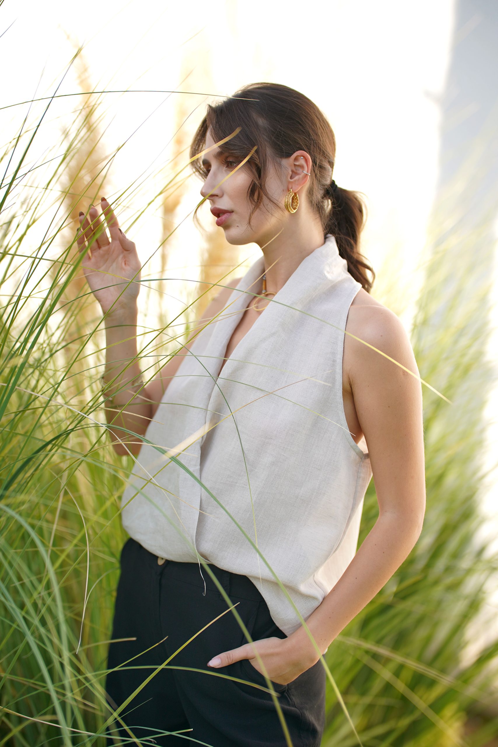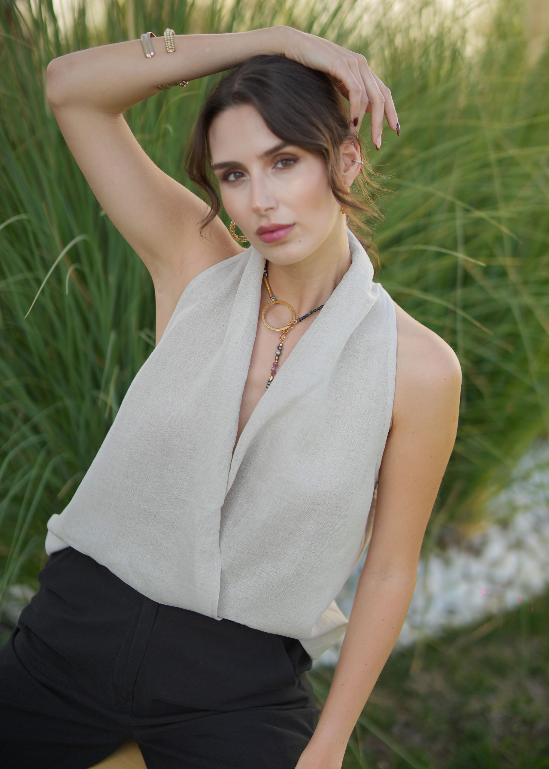 Klasik Vual ve doğal Ketenin kusursuz birleşimi: Viaanka'ya özel üretilen bu kumaş, %80 Ketenin tok duruşunu %20 Pamuk Vualin ipeksi hafifliğiyle harmanlar. Halter yaka kesimi modern bir zarafet sunarken, kumaşın nefes alabilen yapısı İlkbahar ve Yaz aylarının sıcaklarına karşı doğal bir koruma sağlar.