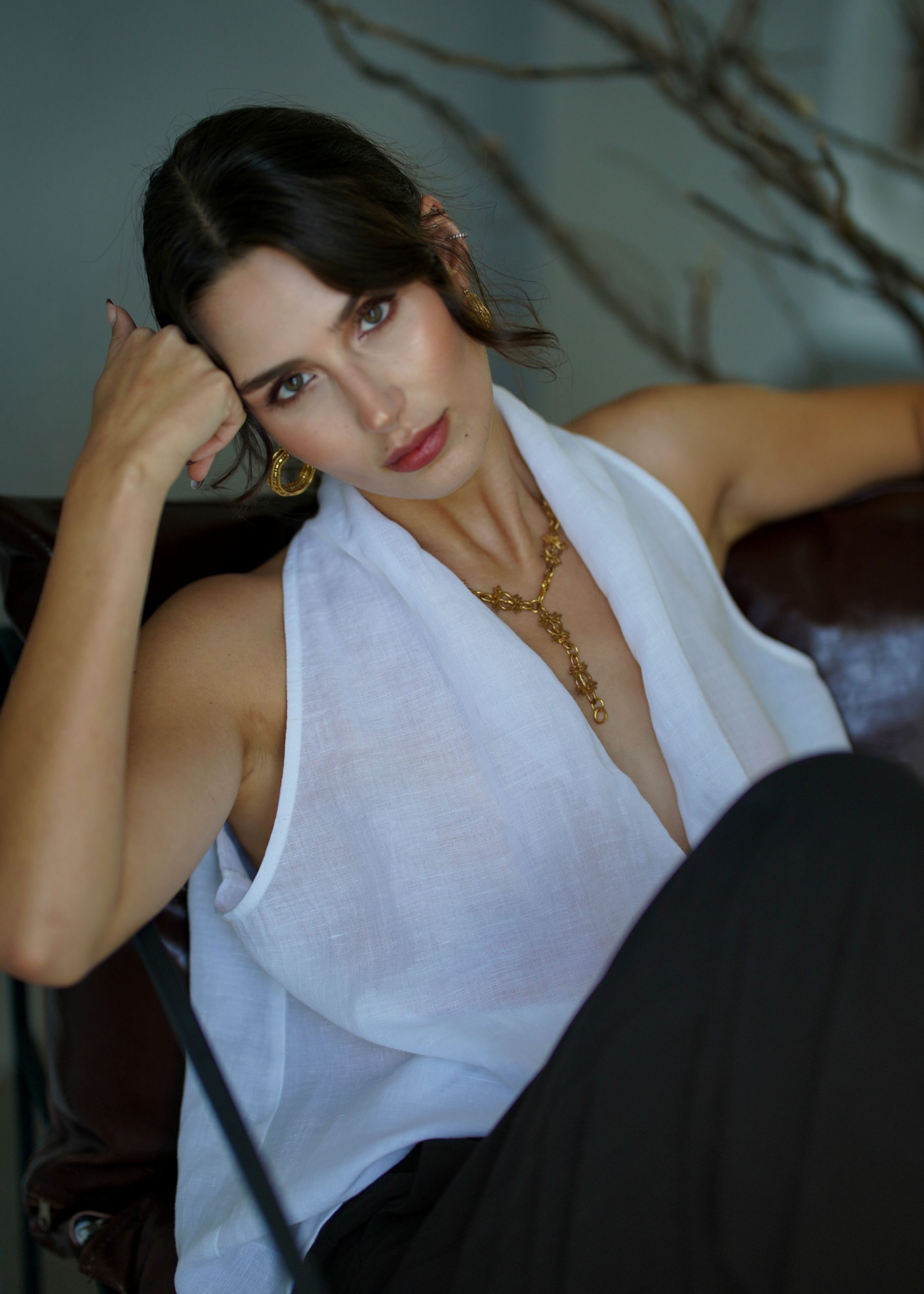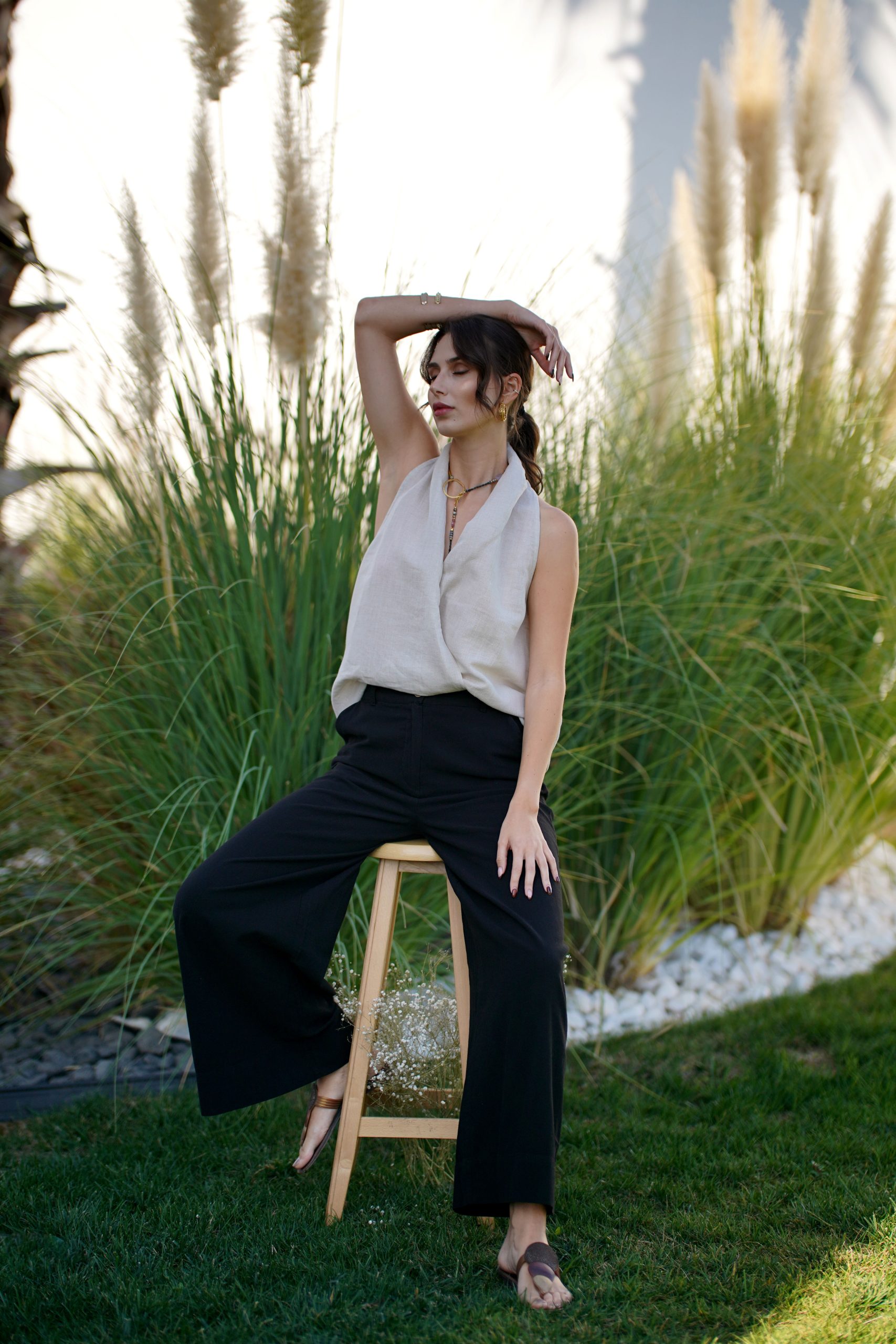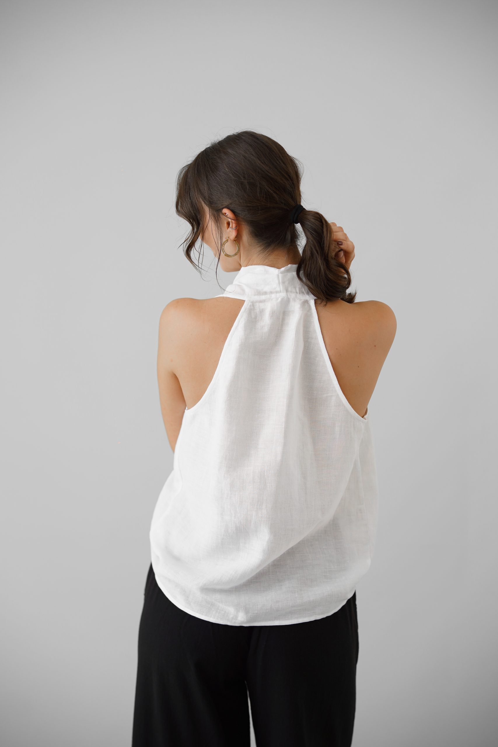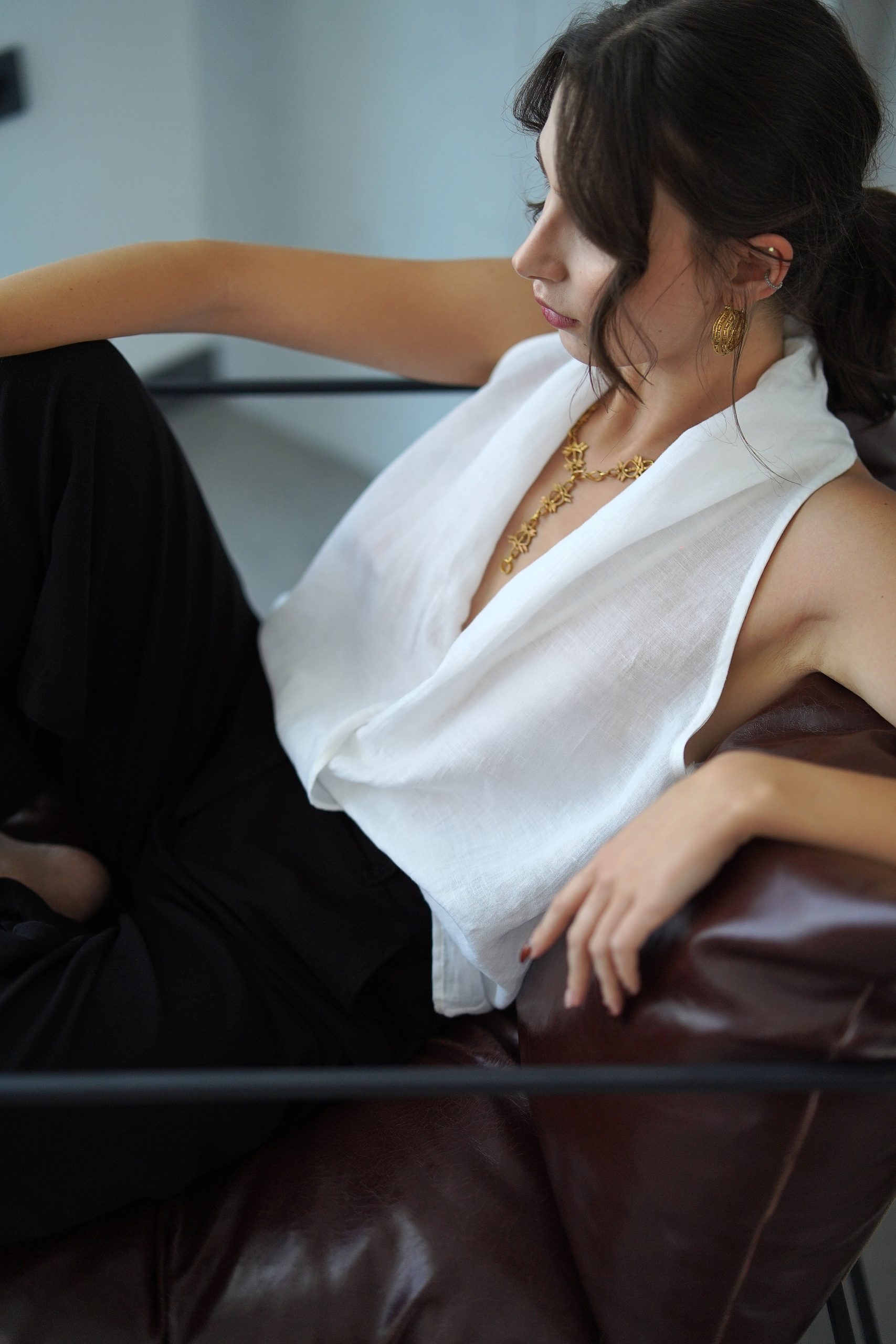 Klasik Vual ve doğal Ketenin kusursuz birleşimi: Viaanka'ya özel üretilen bu kumaş, %80 Ketenin tok duruşunu %20 Pamuk Vualin ipeksi hafifliğiyle harmanlar. Halter yaka kesimi modern bir zarafet sunarken, kumaşın nefes alabilen yapısı İlkbahar ve Yaz aylarının sıcaklarına karşı doğal bir koruma sağlar.