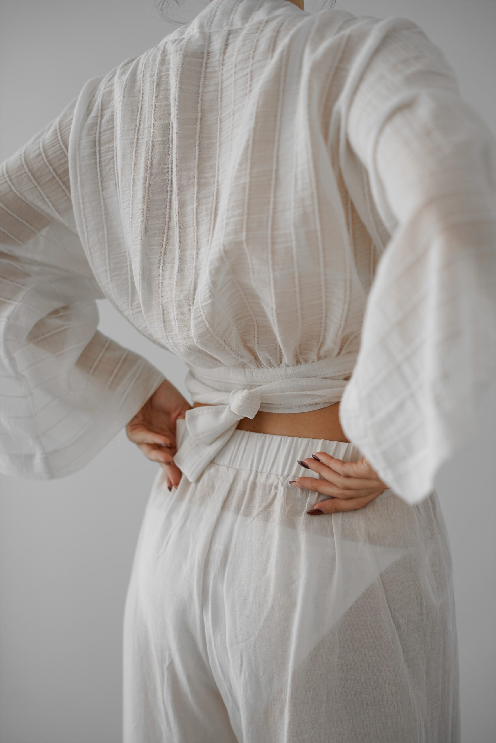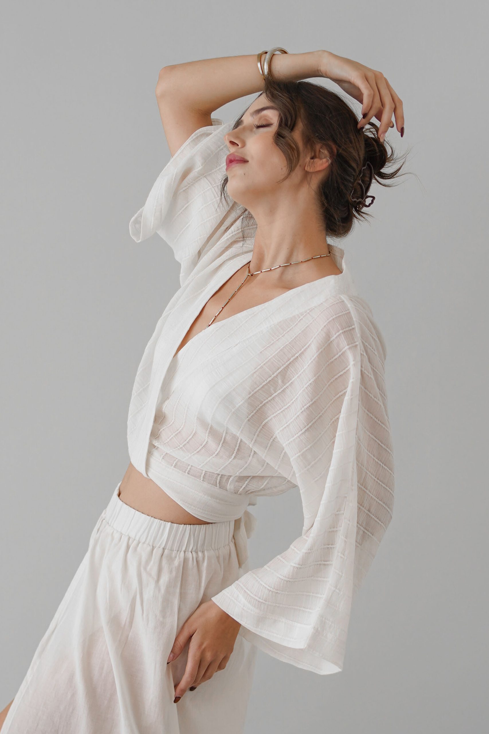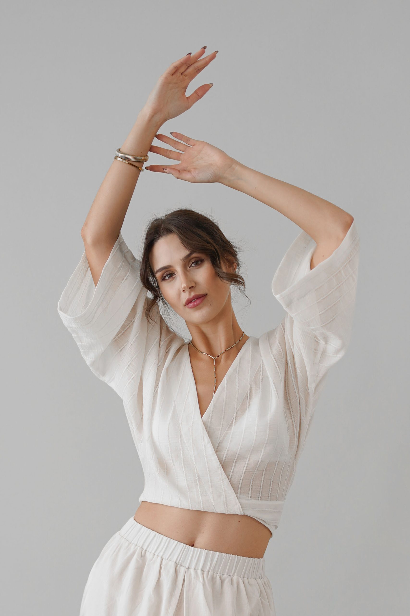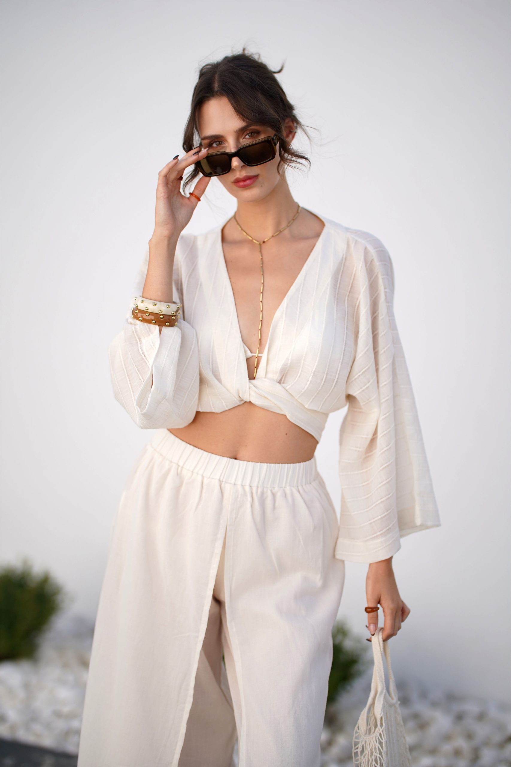 Modern ve cesur bir görünüm sunan büküm detaylı crop kesimiyle yaz enerjisini yansıtır. Geniş, dökümlü kolları harekete özgürlük katar
