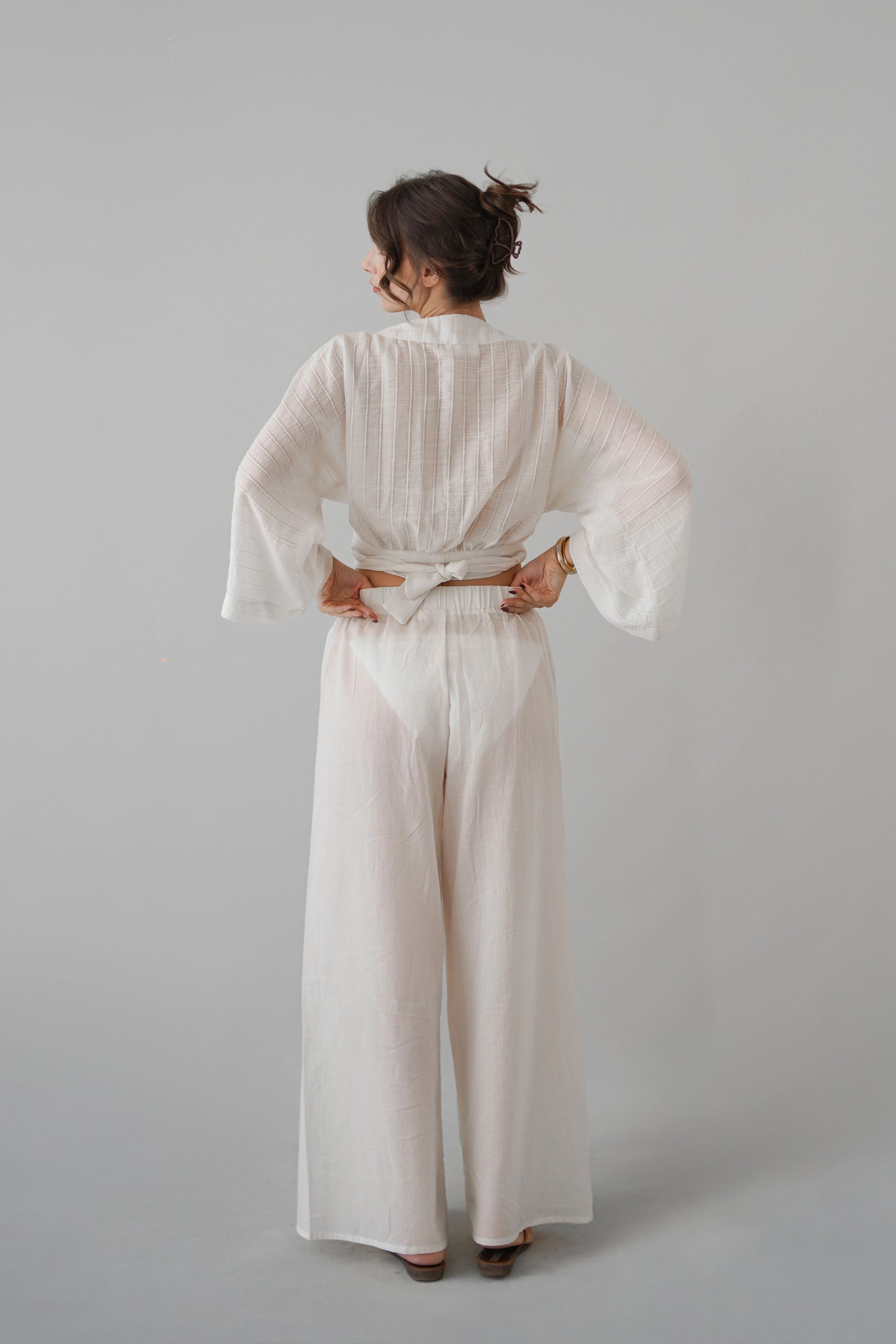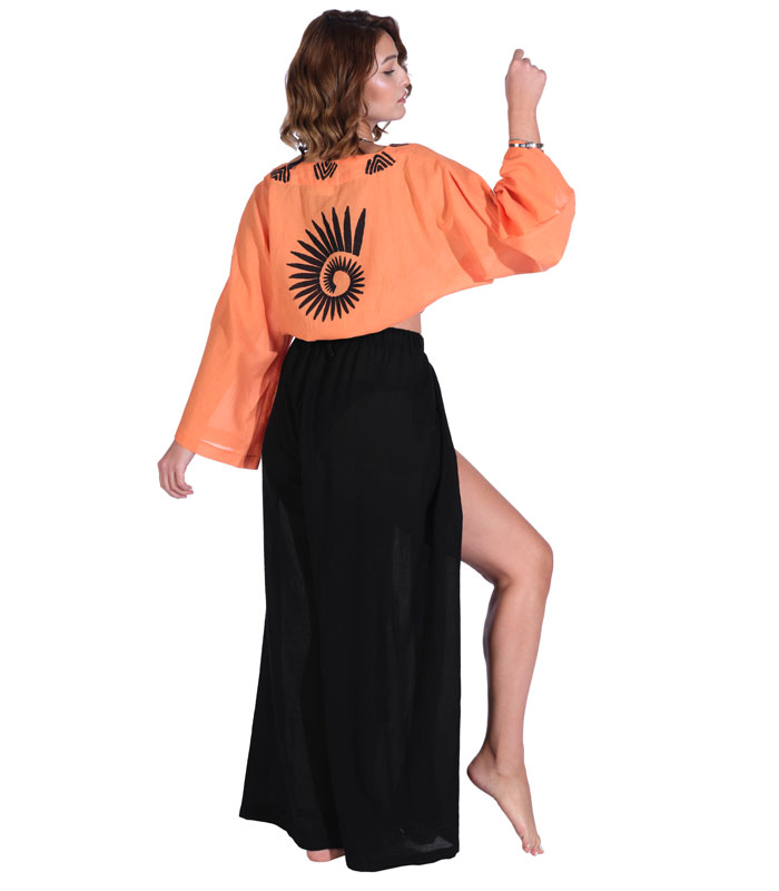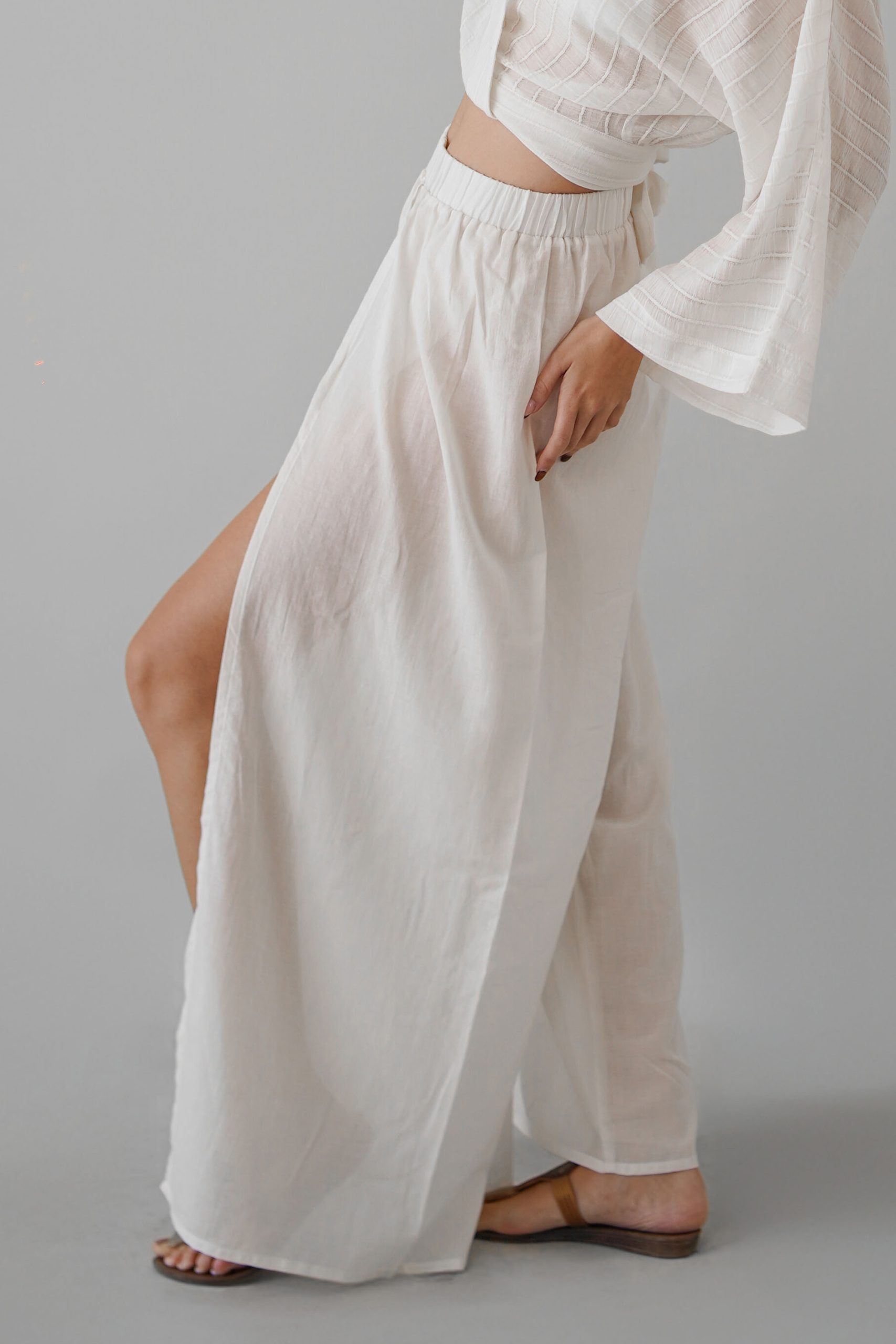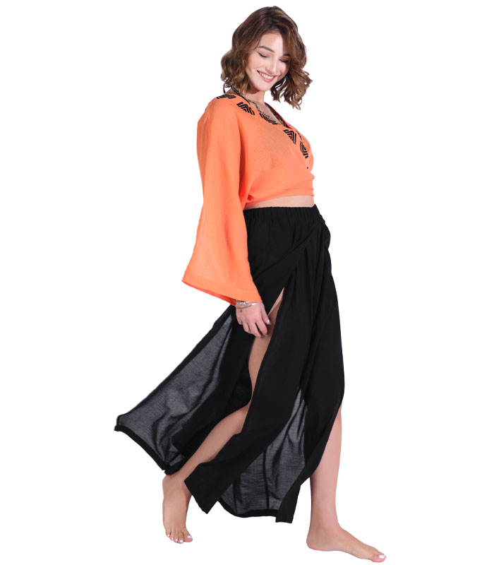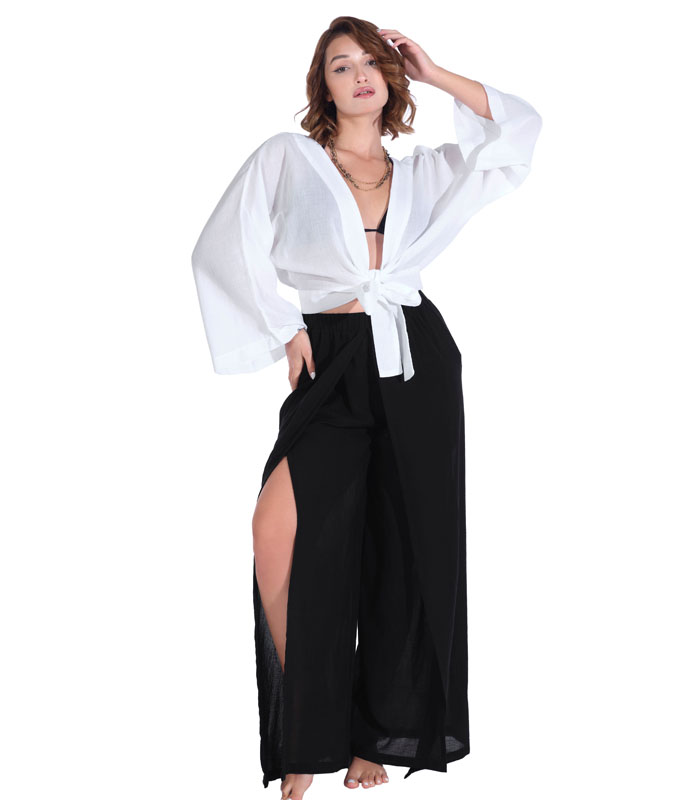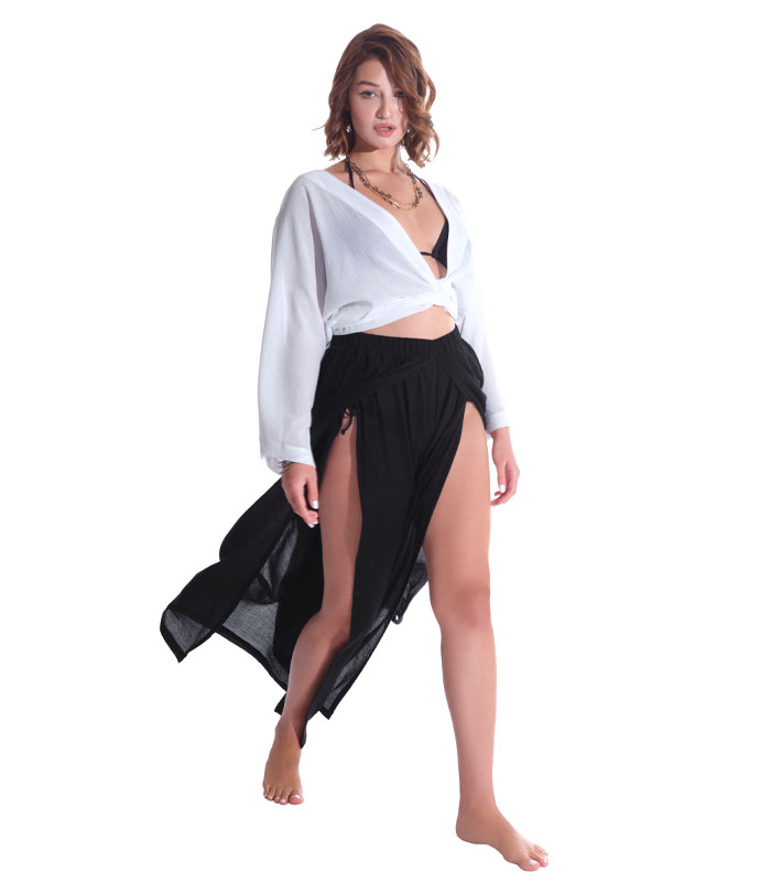 Bu şık ve rahat plaj pantolonu, yaz aylarının vazgeçilmezi olmaya aday! Hafif ve nefes alabilen kumaşı sayesinde sıcak havalarda konforlu bir kullanım sunarken, siyah rengiyle her kombinle uyum sağlar. Yüksek bel tasarımı ve geniş paçaları ile modern ve şık bir görünüm yaratırken, yanlardaki derin yırtmaçlar hareket özgürlüğü ve zarif bir dokunuş katıyor.